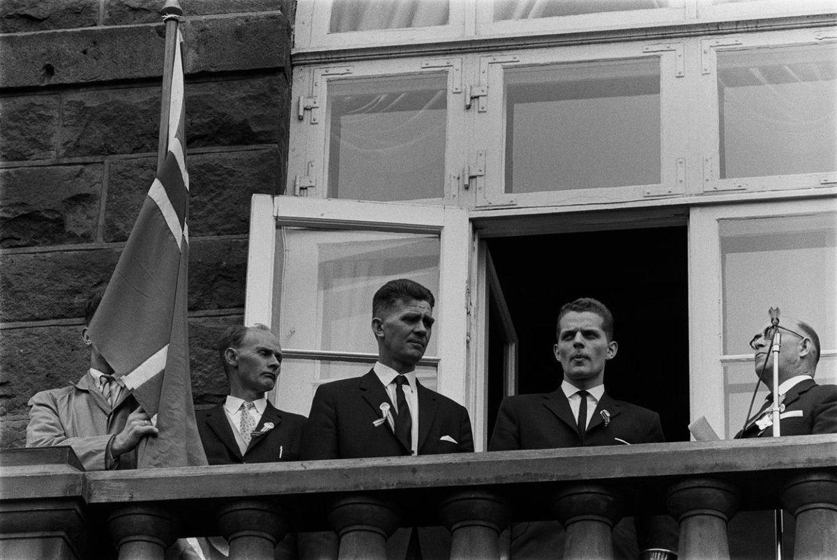 Frá vinstri - fánaberi, Ásgeir Ragnar Þorsteinsson stjórnandi Björgunarsveitarinnar í Vík í Mýrdal fékk afreksverðlaun fyrir björgun áhafnar vélbátsins Hafþórs sem strandaði við Hjörleifshöfða, Bjarni Ingimarsson skipstjóri á Júpíter fékk afreksverðlaun fyrir björgun áhafnar á togaranum Elliða þegar hann sökk út af Breiðafirði og Magnús Gústafsson sem hlaut Fjalarsbikarinn fyrir besta próf í vélfræði frá Vélskólanum. Lengst til hægri er Henry Hálfdánarson fyrrverandi formaður Sjómannadagsráðs sem stjórnaði athöfninni, en fékk sjálfur heiðursmerki Sjómannadagsins úr gulli fyrir störf sín í þágu sjómannasamtakanna áður en hann tók við stjórninni.