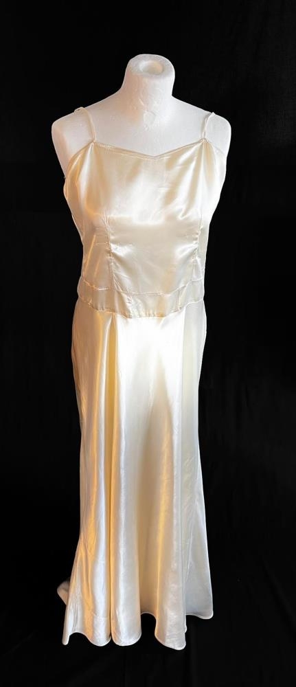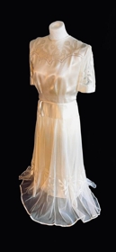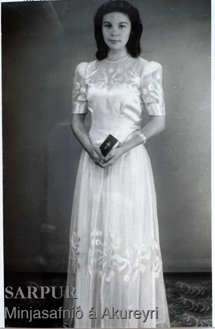 Síður kjóll úr ljósu satíni. Var upphaflega saumaður sem fermingarkjóll á Þórunni Elíasdóttur er hún fermdist í Upsakirkju 1944 en síðan var honum breytt í brúðarkjól og hún klæddist honum þegar hún gifti sig í Vallakirkju í Svarfaðardal árið 1949. Í meðfylgjandi bréfi segir að þegar kom að því að ferma Þórunni þurfti að útvega fermingarkjólinn.Móðir Þórunnar átti frænku á Akureyri sem var saumakona og var fermingarkjólinn pantaður hjá henni og var Jóhanna saumakona látin ráða efni og sniði. Þegar kjóllinn var tilbúinn þá fannst fermingarstúlkunni hann einum of fínn en tjáði sig auðvitað ekkert um það. Það hefði verið mikið vanþakklæti. Veturinn 1945-46 var Þórunn nemeandi í 2. bekk í Menntaskólanum á Akureyri. þann vetur voru haldin tvö síðkjólakvöld á vegum skólans og það voru kjörin tækifæri til að klæðast kjólnum. Einnig var hann lánaður á danssýningu á Hótel Norðurland þennan vetur. Vorið 1949 ákáðu Þórunn og unnusti hennar Yngvi R. Baldvinsson að ganga í hjónaband. Á þessum tíma var mikill vöruskortur og skömmtun á vefnaðarvörum og fleiri vörutegundum. Því var leitað til Jóhönnu frænku ef hún gæti bjargað kjólamálunum. Hún bjó svo vel að eiga afgang af fermingarkjólasatínu og tók að sér að stækka kjólinn og svo gifti Þórunn sig í honum 17. júní 1949. Kjólnum fylgir ljósmynd í ramma, brúðkaupsmynd af Þórunni í kjólnum og eiginmanni hennar Yngva R. Baldvinssyni. Myndin er tekin af Önnu Jónsdóttur í Hafnarfirði.