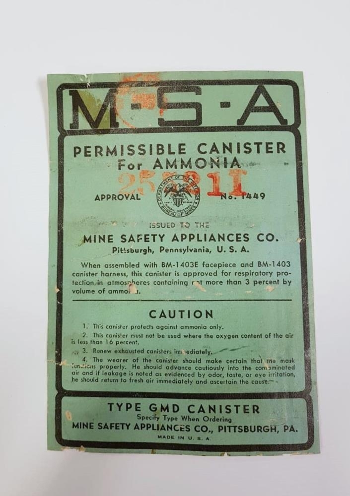 Grænn merkimiði af efnabrúsa úr Hraðfrystihúsi Eyrarbakka 1944-2006. Á miðanum er innihaldslýsing og leiðbeiningar um notkun en efnið virðist vera til varnar ammonia áhrifum. "M-S-A PREMISSIBLE CANISTER For AMMONIA" segir m.a. á miðanum.