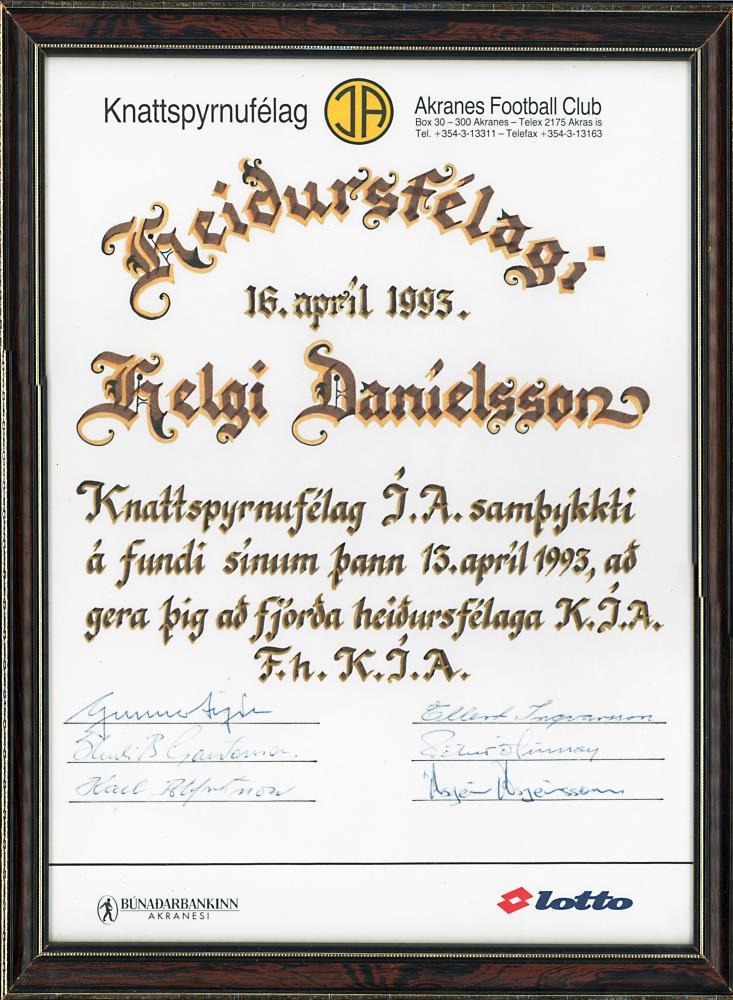 Texti: Heiðurfélagi 16. apríl 1993. Helgi Daníelsson. Knattspyrnufélag Í.A. samþykkti á fundi sínum þann 13. apríl 1993, að gera þið að fjórða heiðursfélaga K.Í.A.