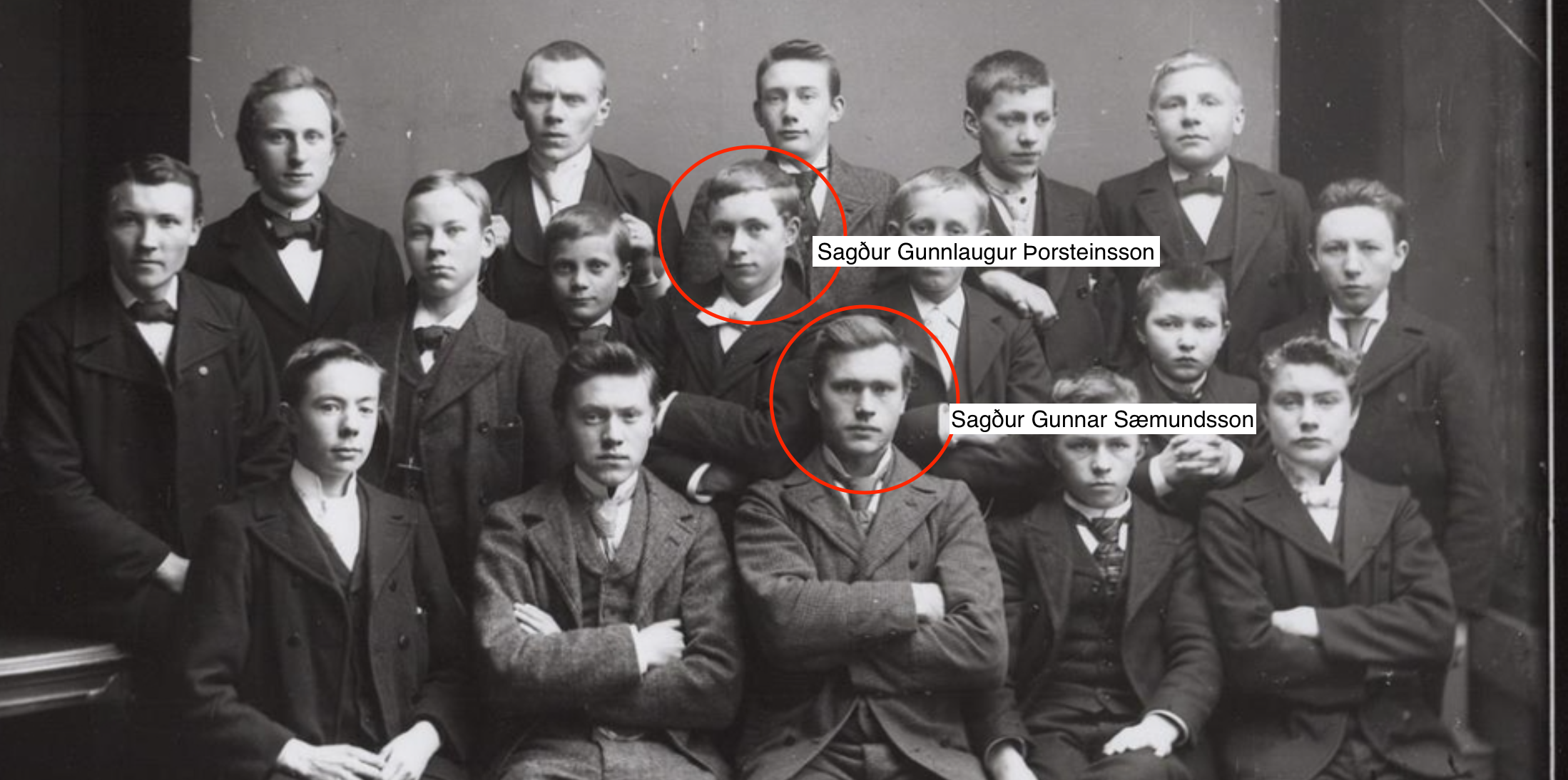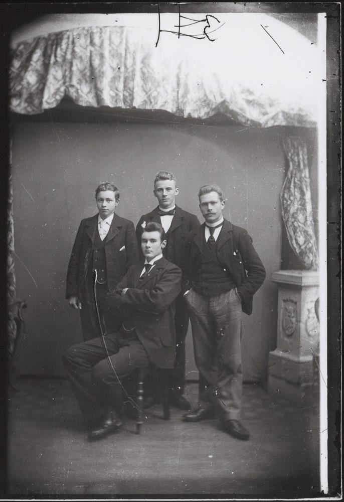 Fremst Pétur Sigurðsson (1881-1908) guðfræðinemi. Aftari röð, sennilega, f.v. Gunnlaugur Þorsteinsson (1884-1946) læknir, óþekktur og Gunnar Sæmundsson guðfræðingur. Ekki 100% viss með þá tvo. (SBB 2026)