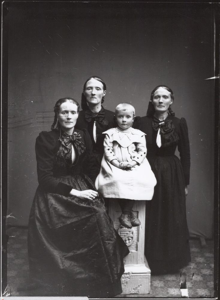 Hópmynd. 3 konur og lítil telpa í sparikjól með skrautkraga.