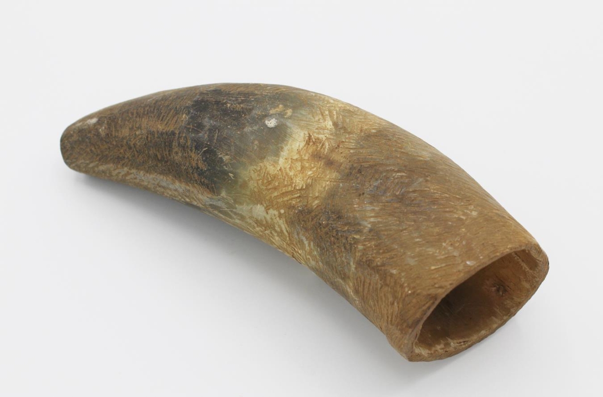 Horn. Nautshornið er hálfsmíðaður tóbaksbaukur, vantar gaflinn og tappann. Einnig er eftir að pressa hornið saman. Smíðað af Magnúsi eða Sigurði Hannessonum í Hólum á Stokkseyri, sennilega í kringum 1950 að sögn Helga Ívarssonar.