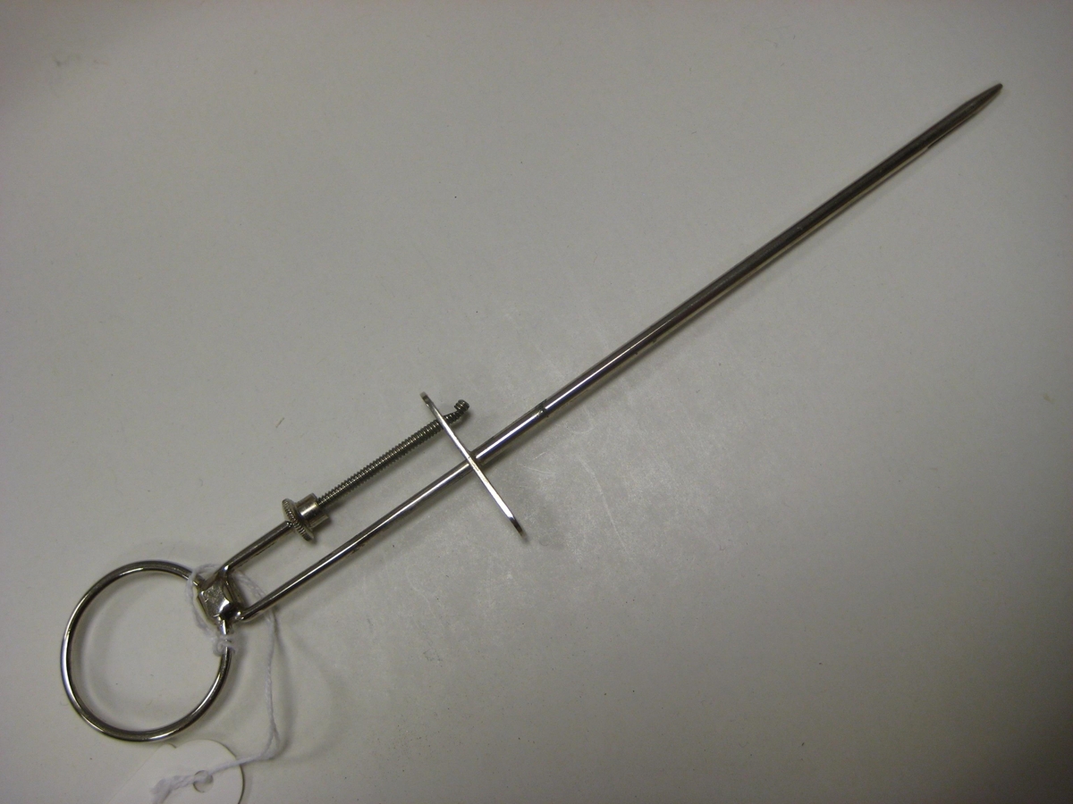 Prjónn með hring og stilliskífu. Farið var með nálina upp í spena ef fastmjólka var, til að víkka spenagatið.