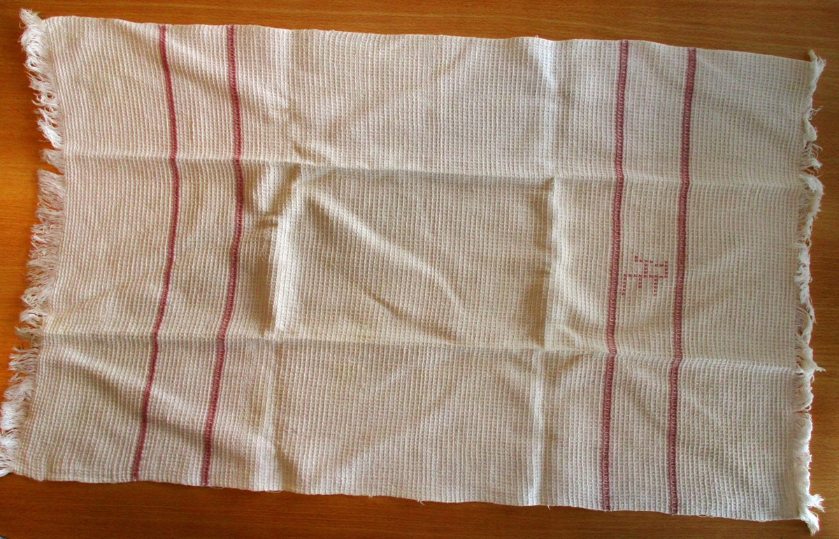 Handofið handklæði af gefanda sem hún óf árið 1950. Ljósdrapplitt með fjórum bleikum röndum og ísaumuðum stöfum A.E.