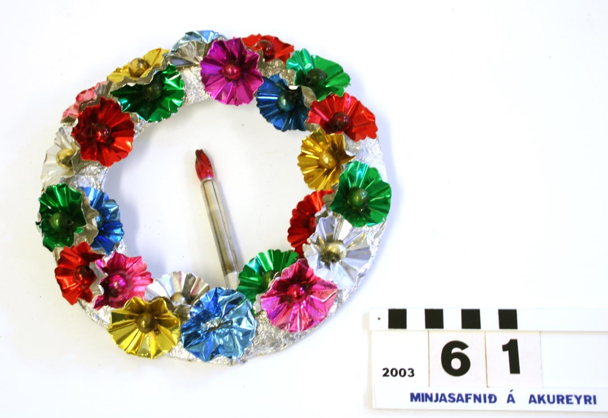 Í miðju hringsins er kerti úr silfurpappír með rauðum kveik. . Aftan á
