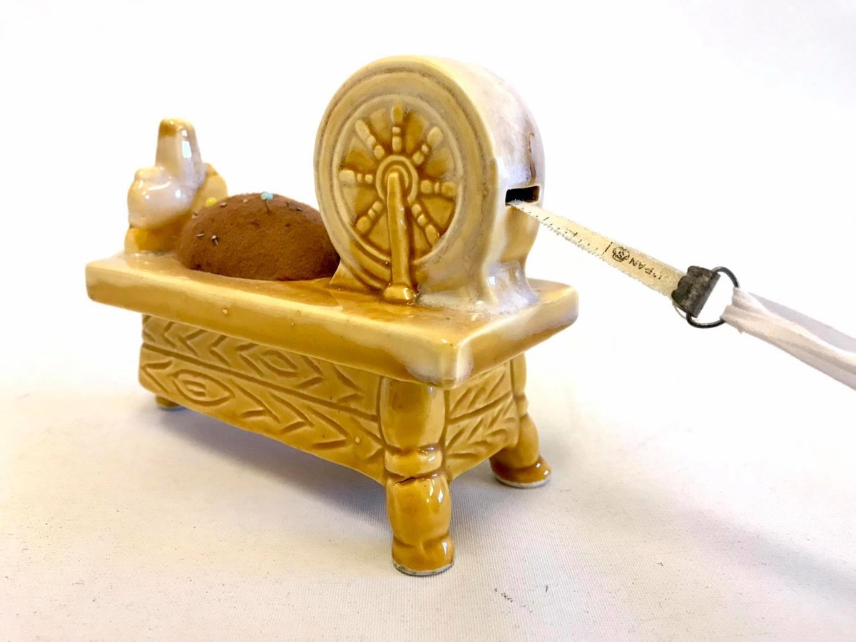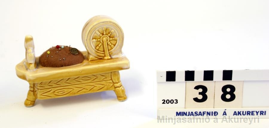 Nálapúði er festur á gulleitri glerstyttu sem er í líkingu við rokk. Púðinn er úr brúnu flókaefni. Innan í rokkhjólinu er lítið málband sem dregið er út um op.