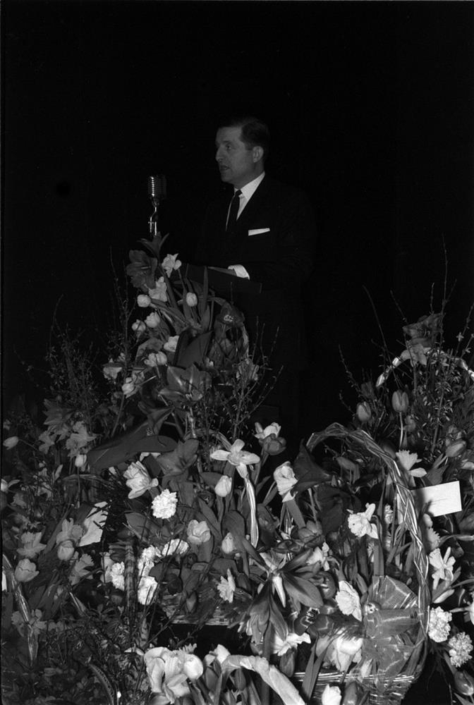 Ræðumaður í púlti, blómaskreyting í forgrunni.