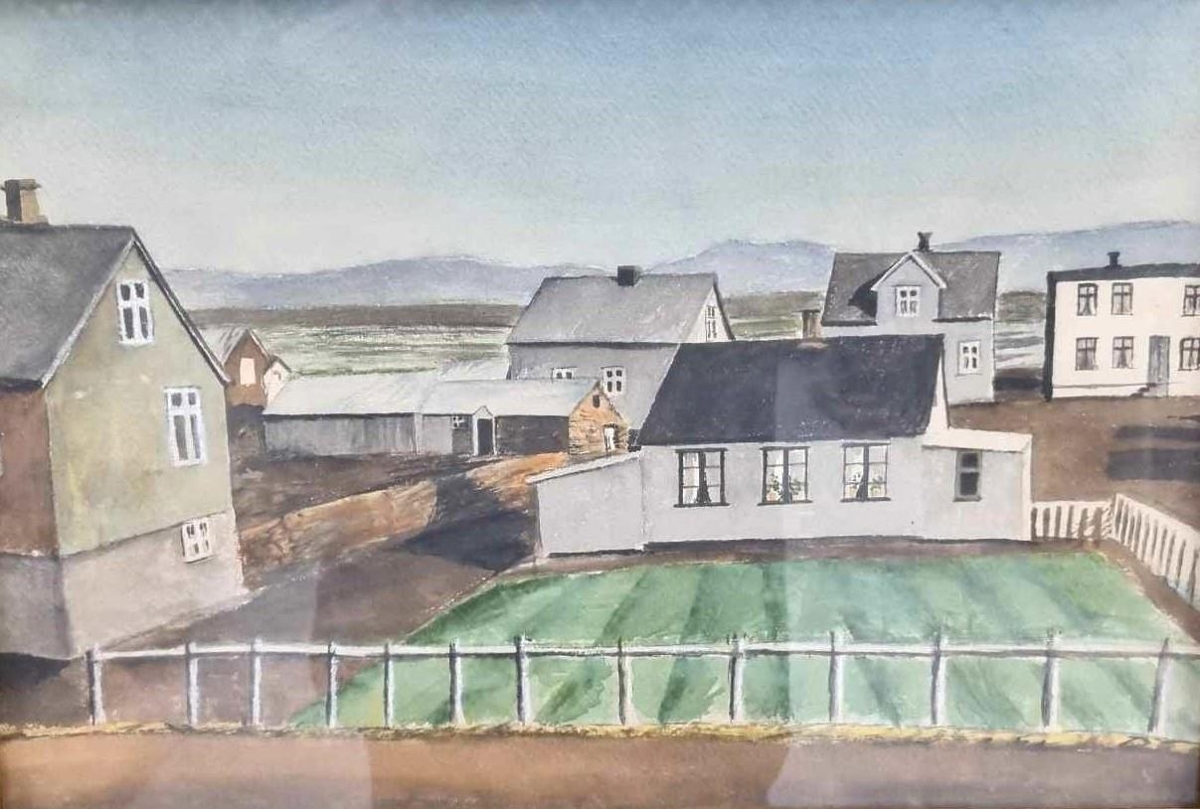 Vatnslitamynd af Einarhafnarhverfinu, í ramma.