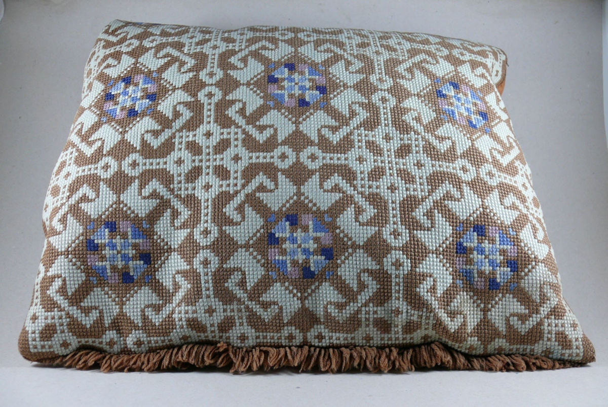 Útsaumaður púði með munstri af ferningum og krossum. Inn í miðjum ferningunum eru bláir og fjólubláir krossar. Lítið kögur á langendum og einlitt brúnt efni að aftan.