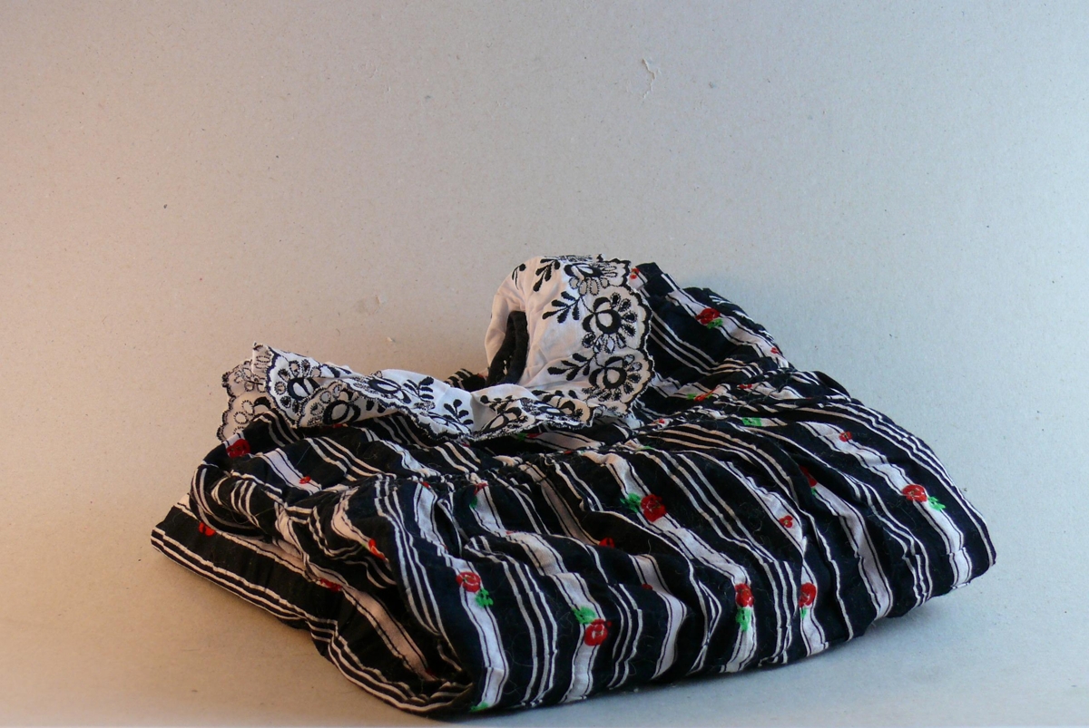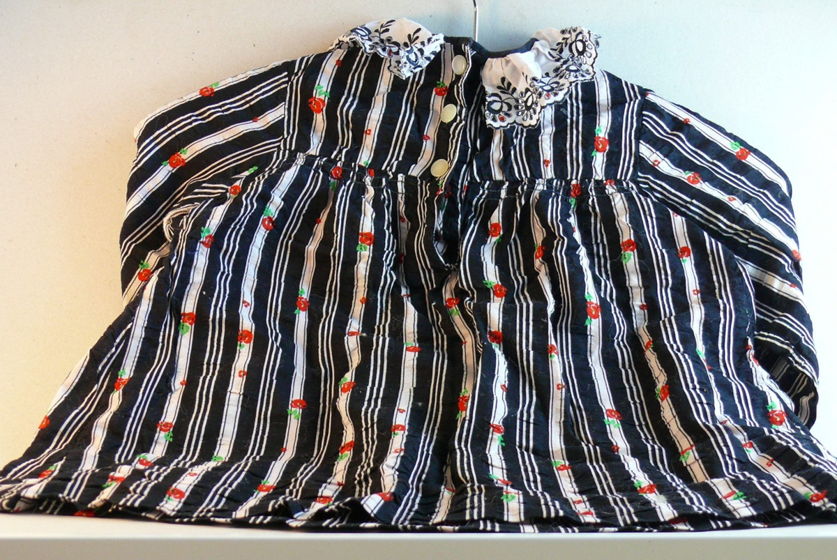 Svört skyrta með blúndukraga, ljósum röndum og rauðum og grænum blómum, samskonar og smekkbuxurnar. Vantar tölu á annað axlarbandið. Staðsett í hvítum plastpoka í skáp aftan við hurð.