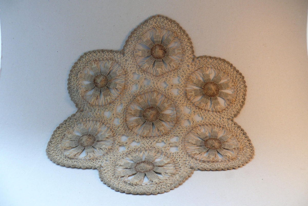 Brúnleitur lítill dúkur sem Theodóra Thoroddsen gerði og gaf Auði, aðferðin við gerð dúksins kallast teneriff