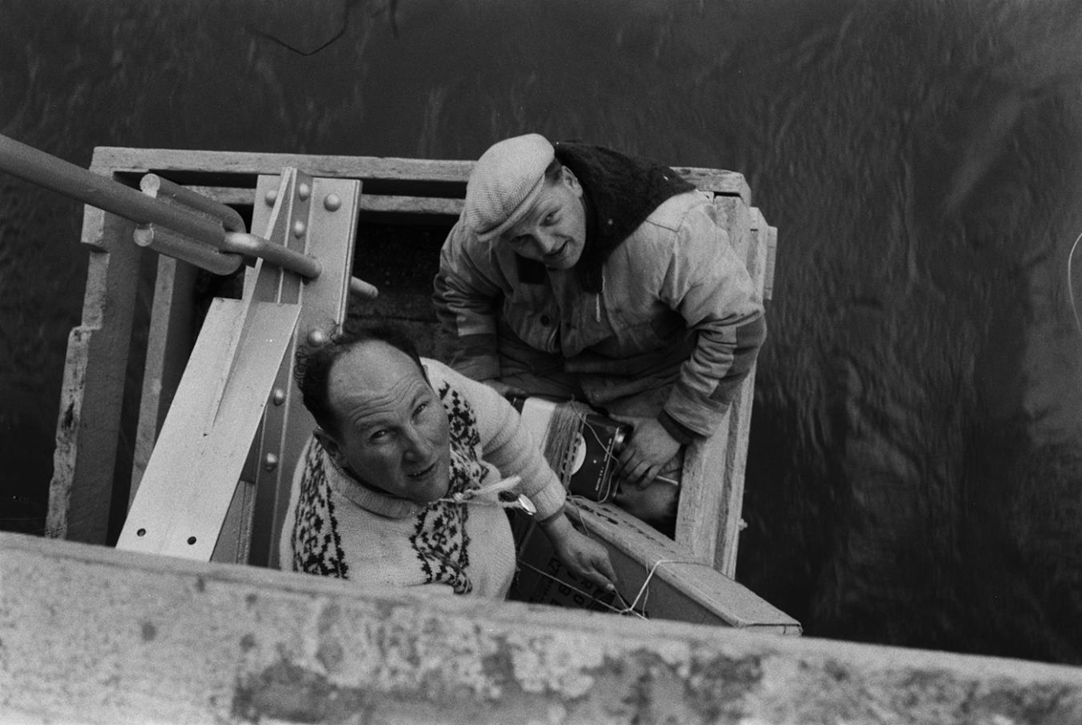 Flóðið varð í apríl, dagana í kringum miðjan mánuðinn. Myndin er tekin á Selfossi við brúna. Verið er að mæla, tveir menn í kláfi sem er látinn síga niður að vatninu með mælitæki.