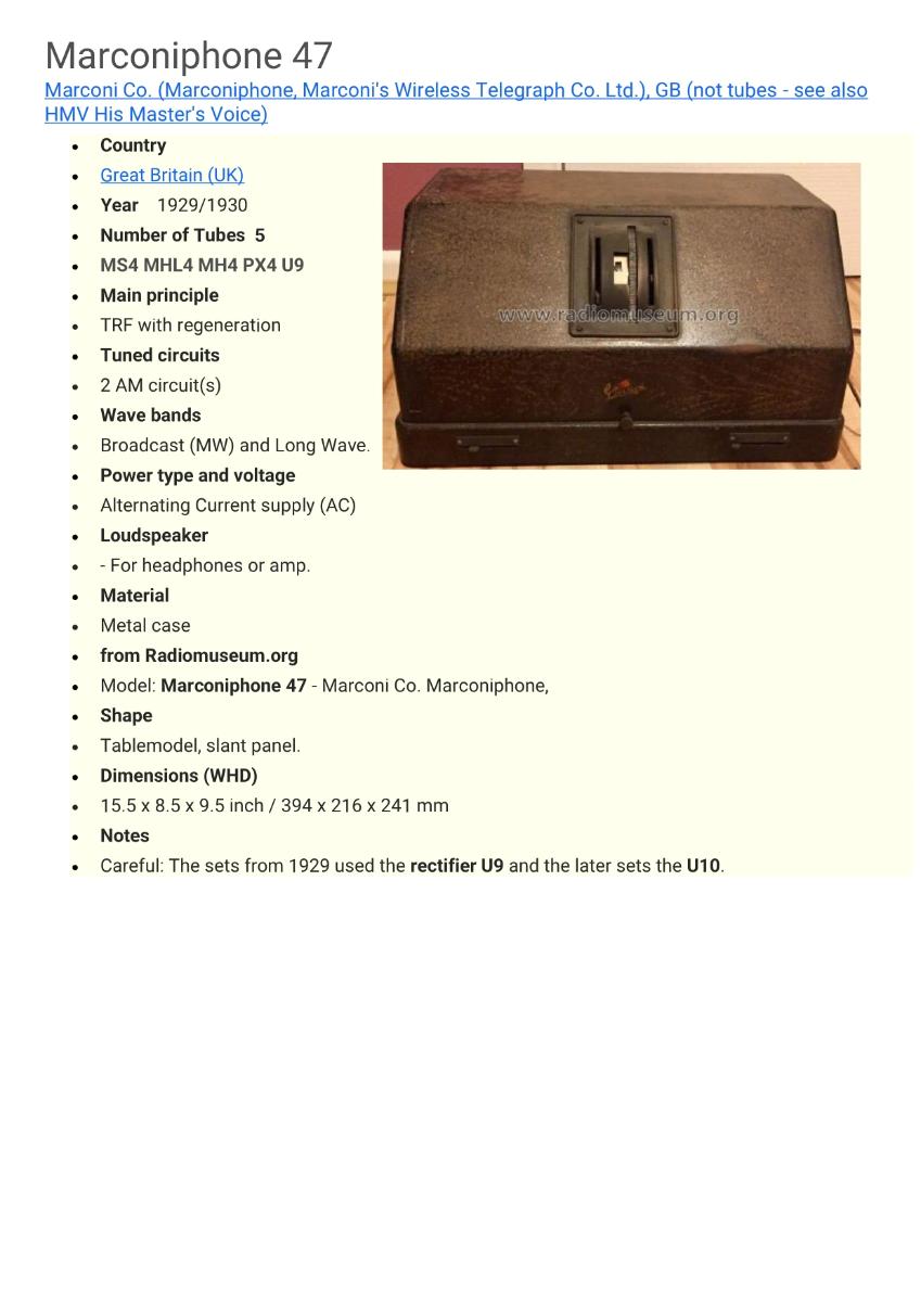 Marconiphone 47 model 1929 5 lampa útvarpstæki frá fyrstu árum útvarpssendinga á Íslandi. Var í notkun fram undir árið 1950. Þessi tæki voru framleidd í tvö ár; 1929-1930 á Bretlandi. Bylgjusvið er langbylgju og miðbylgju. Það gengur aðeins fyrir riðspennu. Nota þurfti lausan hátalara eða heyrnatól við tækið.