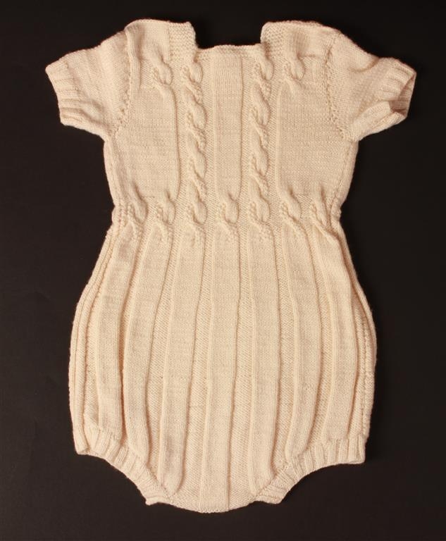 Fallega prjónuð ungbarnasamfella með kaðlaprjóni. Stuttar ermar og buxurnar skálmalausar. Á við ungbarnasokka nr. 1994-10-25 og húfu nr. 1994-10-26.