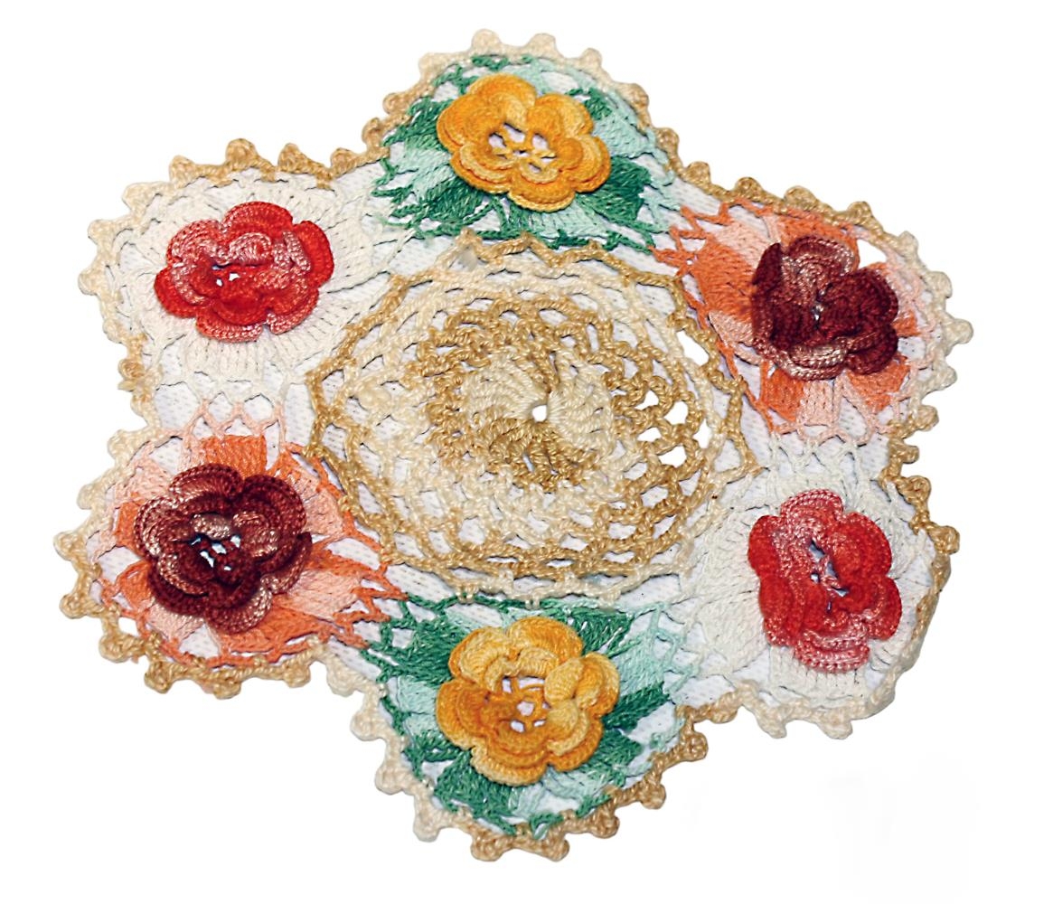 Dúkurinn er settur saman með sex mislitum blómadúllum og tengdur saman með hekli í miðjunni.
