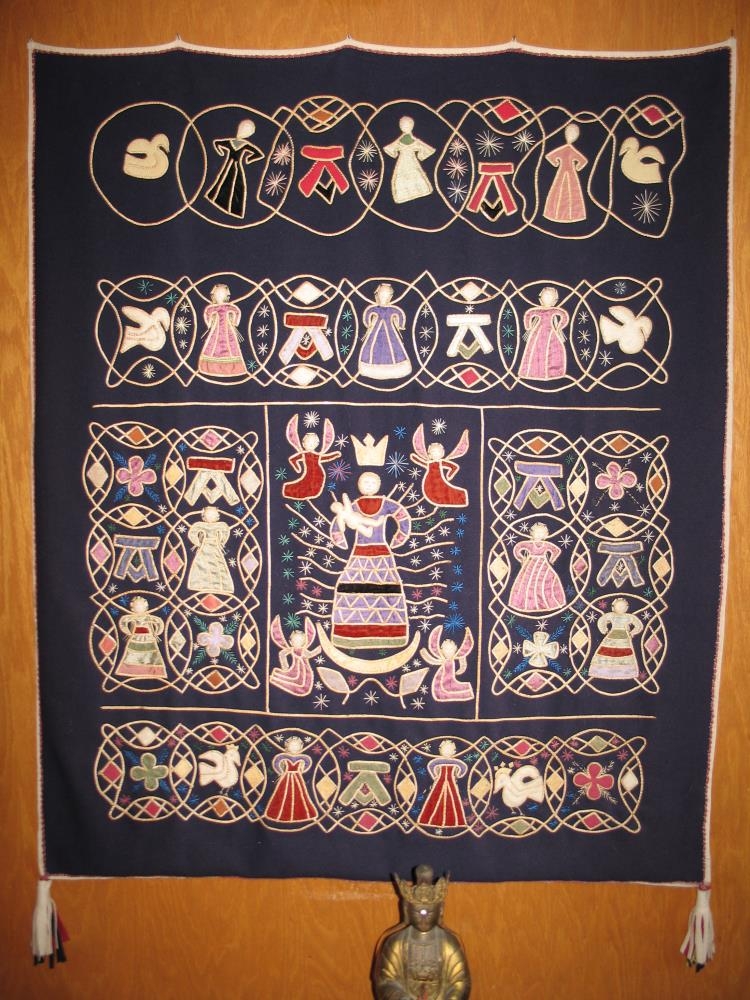 Var gjöf frá Auði til Halldórs í tilefni Nóbelsverðlaunanna. Teppið saumaði hún eftir fornu altaristeppi á Þjóðminjasafninu (Safnnúmer A: Skg 307). Klæðið var upphaflega í Reykjakirkju í Skagafirði. Í miðju teppisins er María guðsmóðir með barnið og englar allt um kring.
