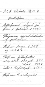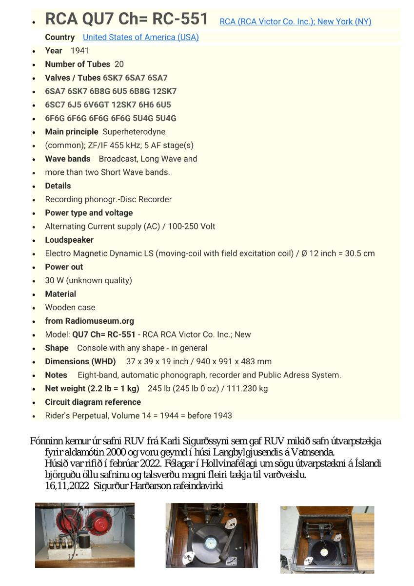 Radíófónn, gerð: RCA (RCA Victor Co. Inc.); New York (NY) .Tíðnisvið: Langbylgjur og meira en tvær stuttbylgjur, riðstraumstæki: AC) 100-250 Volt. Hátalari: Electro Magnetic Dynamic LS (moving-coil with field excitation coil). Útgangsstyrkur 30 wött.