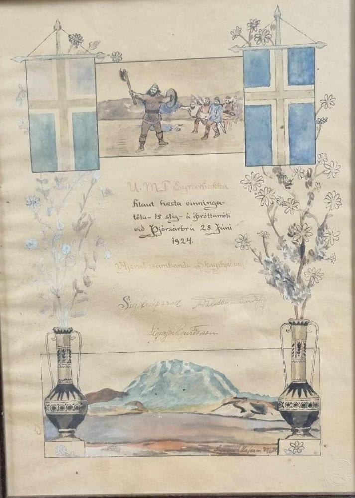 Innrammað viðurkenningarskjal frá Héraðssambandinu Skarphéðni til Ungmennafélags Eyrarbakka. UmfE "hlaut hæsta vinningatölu - 15 stig - á íþróttamóti við Þjórsárbrú 28. júní 1924." Undir skjalið skrifa Sigurður Greipsson, Aðalsteinn Sigmundsson og Sigurjón Sigurðsson. Neðst í hægra horni er nafn þess sem gerði skjalið sem var Sigurjón Ólafsson myndhöggvari sem hefur sumarið 1924 verið 16 ára.