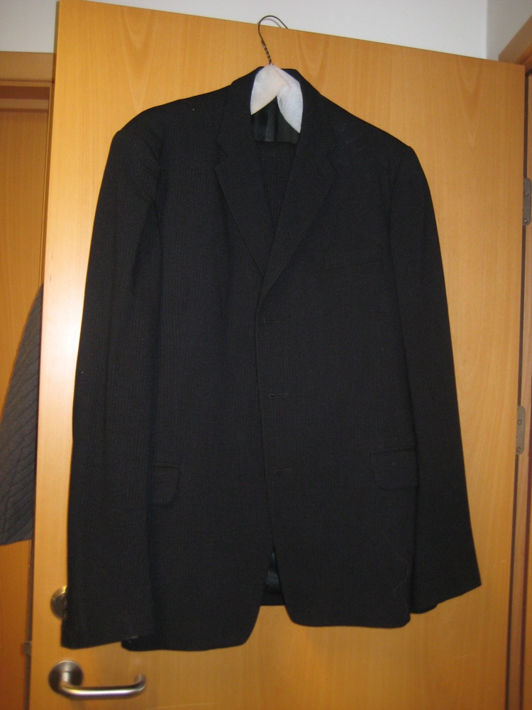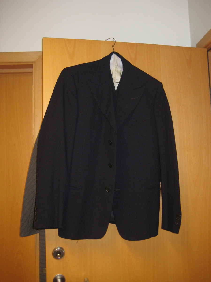 Fatnaður. Jakkaföt, frakkar og aðrar yfirhafnir frá uþb.1955 til 1980. Notuð af Helga Ívarssyni í Hólum. Einnig er fatnaður frá Jónu Hannesdóttur í Hólum á Stokkseyri. 3486: Tvenn jakkaföt, teinótt og svört.