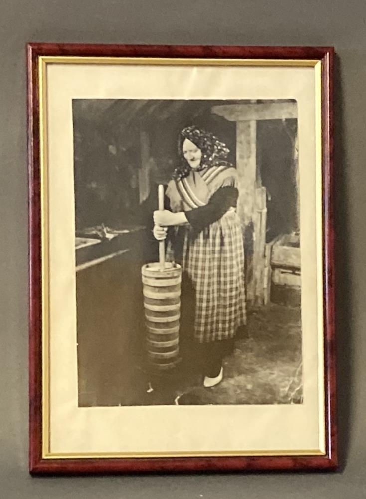 Innrömmuð ljósmynd af Dýrfinnu Jónsdóttur húsfreyju í Eyvindarhólum að strokka smjör. Strokkurinn er smíði Bjarna Sverrissonar í Melhól í Meðallandi frá um 1870 og er safneign í Byggðasafninu í Skógum. Ljósmynd: Vigfús Sigurgeirsson.