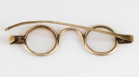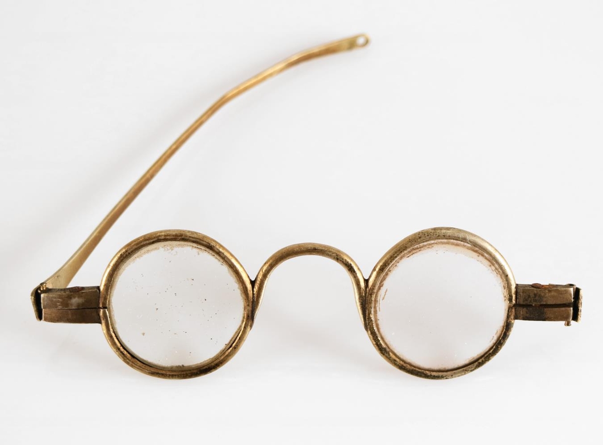 Gleraugu úr látúni. Glerin eru kringlótt, 3 cm að þvermáli. Aðra eyrnaspöngina vantar, en hún hefur brotnað af. Hin spöngin er grönn og flöt, gat er í enda hennar. Samanbrotin eru gleraugun 12,5 cm að lengd. Byggt á útliti gleraugnanna eru þau líklega frá fyrri hluta 20. aldar.