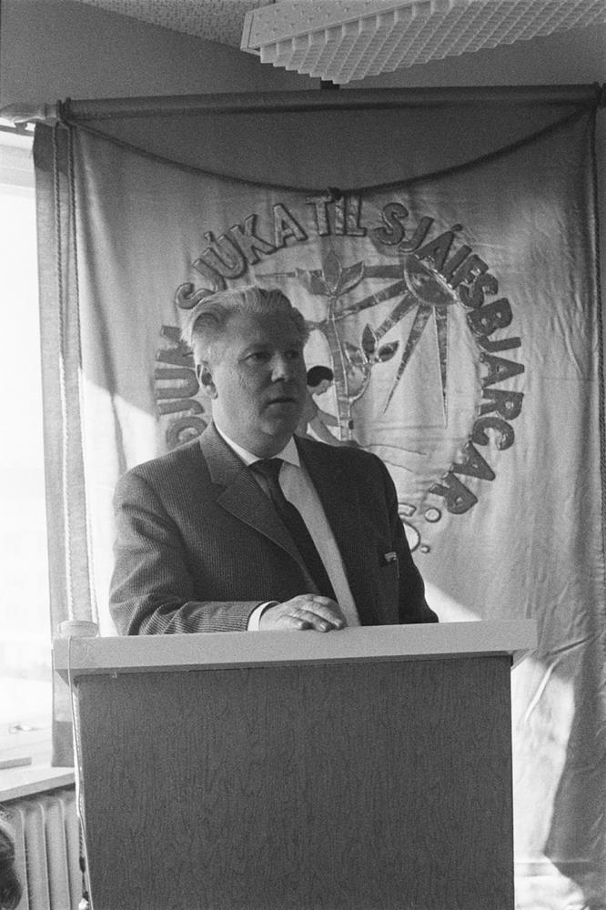 Haldið í Reykjavík og hófst 7. september 1962. Ræðumaður í púlti. Fáni í baksýn: Styðjum sjúka til sjálfsbjargar.