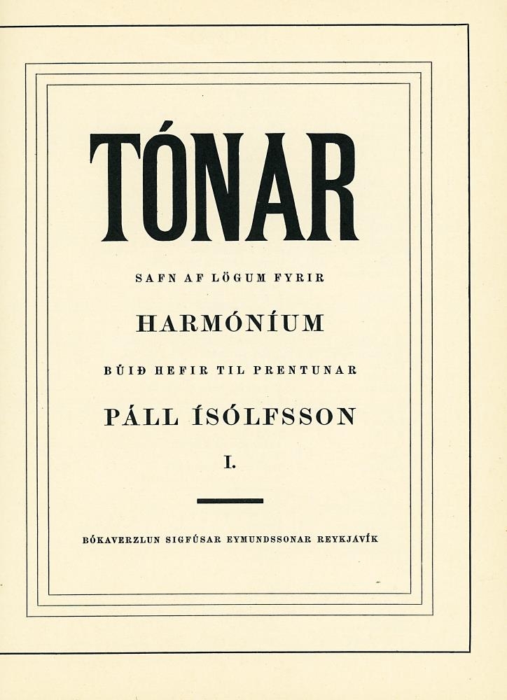 Tónar : safn af lögum fyrir harmóníum 1. / búið hefir til prentunar Páll Ísólfsson. - Reykjavík : Bókaverzlun Sigfúsar Eymundssonar, 1934. - 42 bls. : nótur