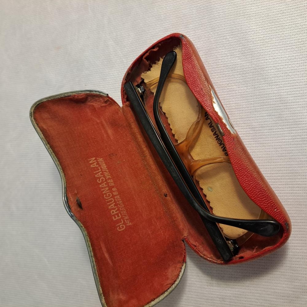 Gleraugu úr búi Jóhanns Skaptasonar sýslumanns. Komu í vel notaðri fölrauðri öskju. Á innanverðu loki öskjunnar er merkingin: Gleraugnasalan, Lækjagötu 6a, Reykjavík.