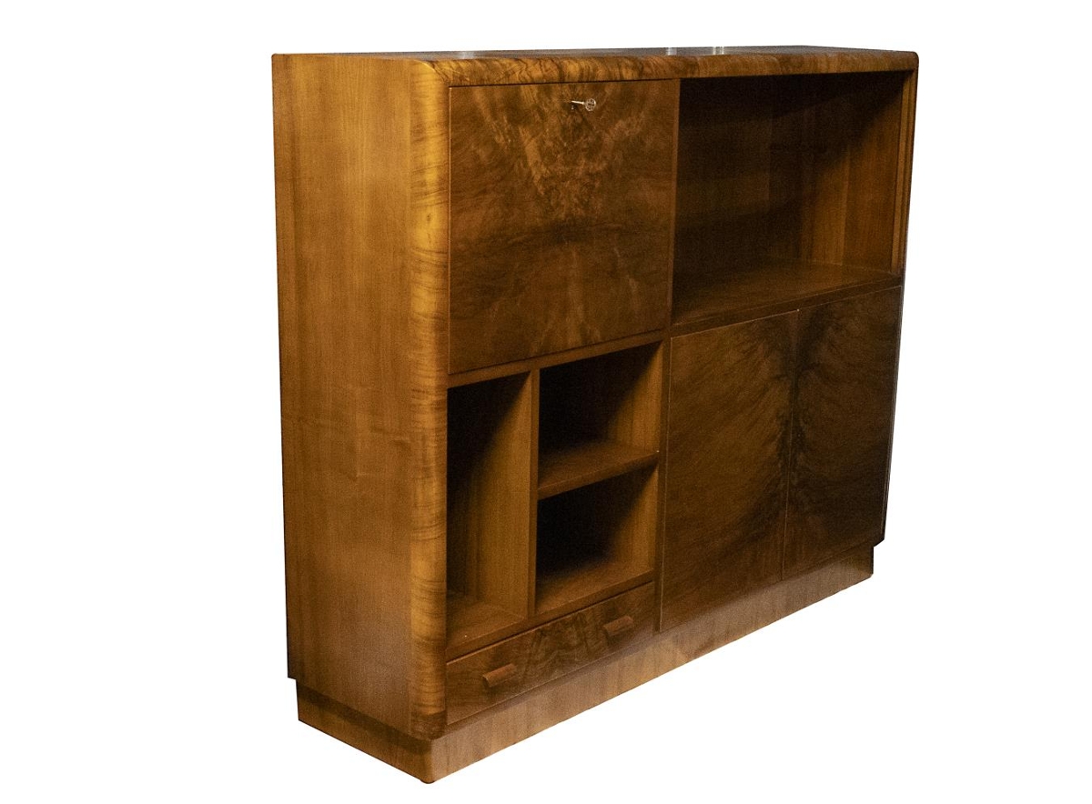 Borðstofuskápur með tveimur skúffum og tveimur hurðum, hillum, gler-rennihurðum og skápur sem með hólfum fyrir r bréfsefni og nothæft sem skrifpúlt.