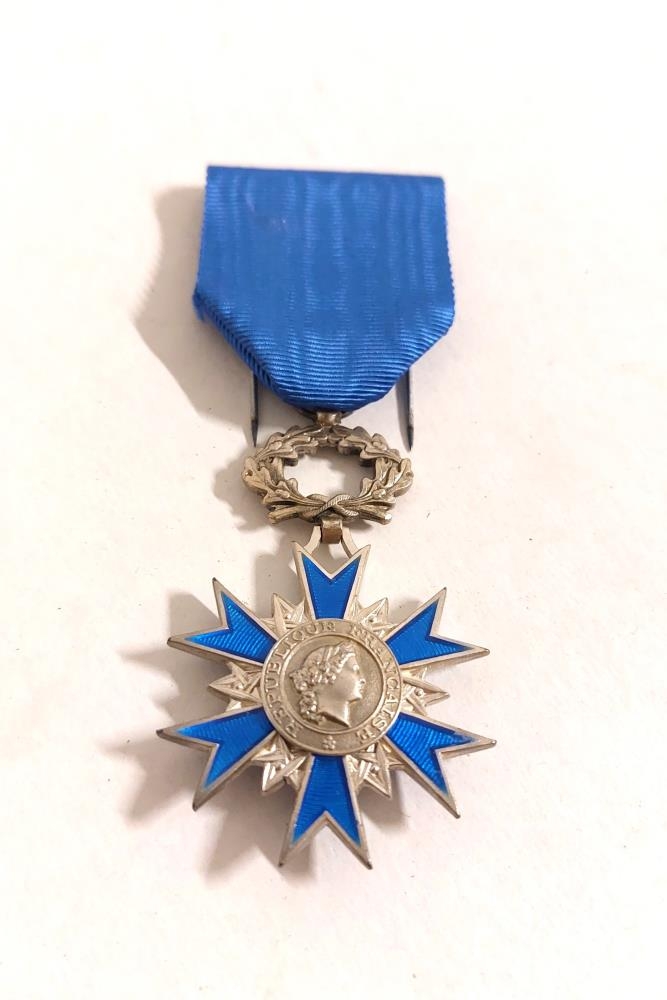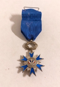 Frönsk heiðursorða, ORDRE NATIONAL DER MÉRITE, frá 1966, innrammað skjal fylgir. Tengist fyrirgreiðslu Björns Fr. Björnssonar sýslumanns Rangárvalla við 4 eldflaugaskot franskra vísindamanna á Skógasandi og Mýrdalssandi 1964 og 1965. Gefendur : Ragnheiður Jónsdóttir og fjölskylda.