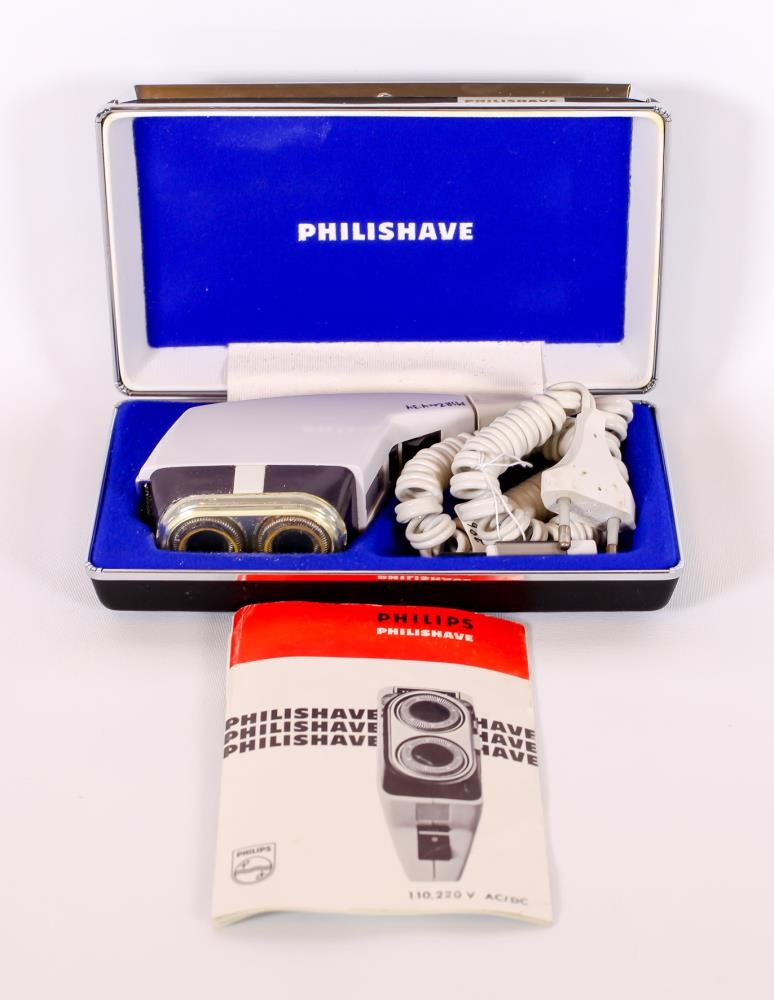 Rakvél „ Philips; í svörtum upprunalegum kassa áletrun: PHILISHAVE. Rakvélina fék Finnur í fermingargjöf. Rakvélin sjálf er hvít úr plasti með hvítri gúmmí gorma rafmagnssnúru. í settinu er lítill svartur bursti með hvítu plast haldi. Kassinn er fóðraður með bláu flaueli