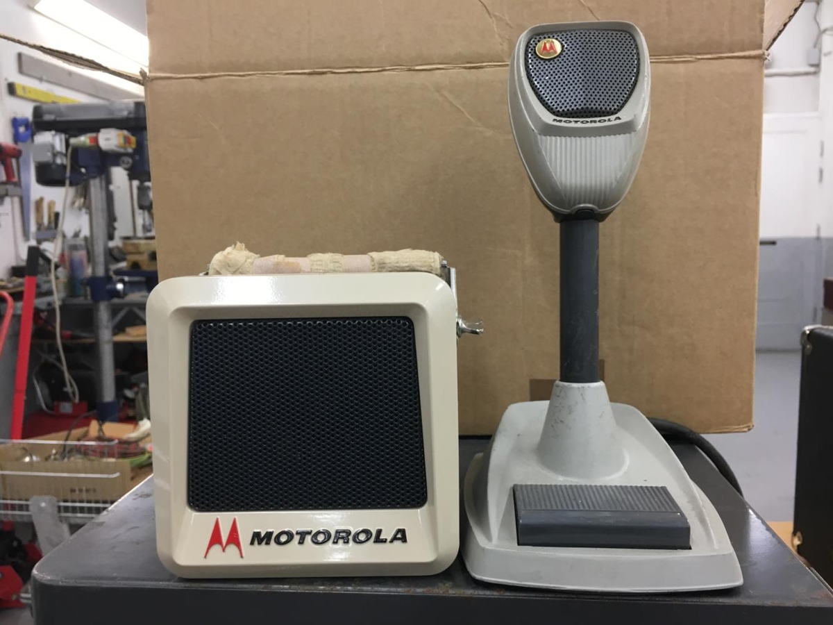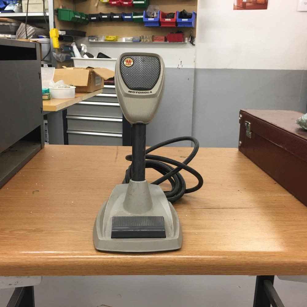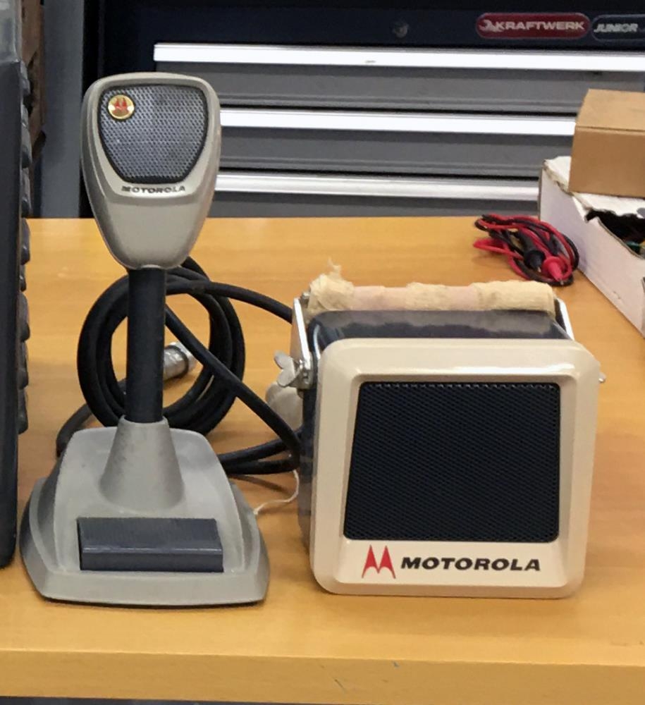 Motorola borðhljóðnemi og hátalari við móðurstöðvar sem voru algengar á fyrstu árum VHF talstöðva bæði hjá opinberum aðilum o.fl., eins og lögreglu, slökkviliði og hernum á Keflavíkurflugvelli, þaðan sem þessir gripir koma.