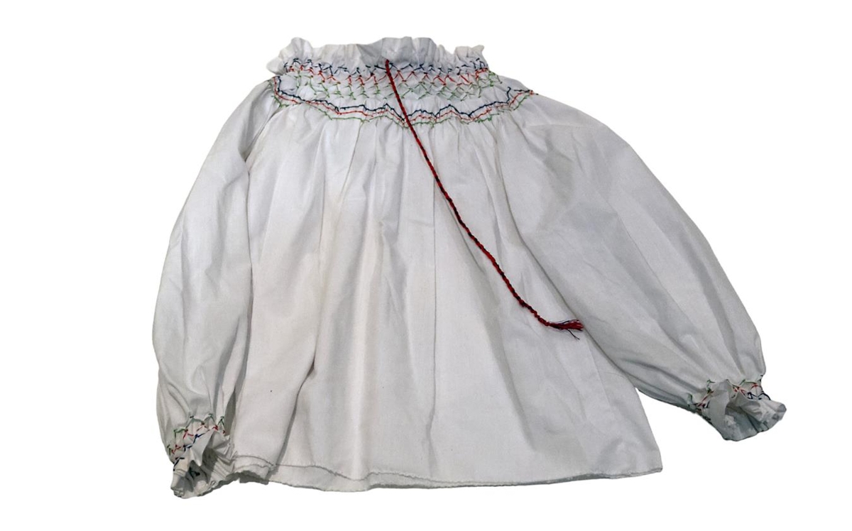 Hvít bómullarskyrta með vöflusaumsmunstri við hálfs-málið