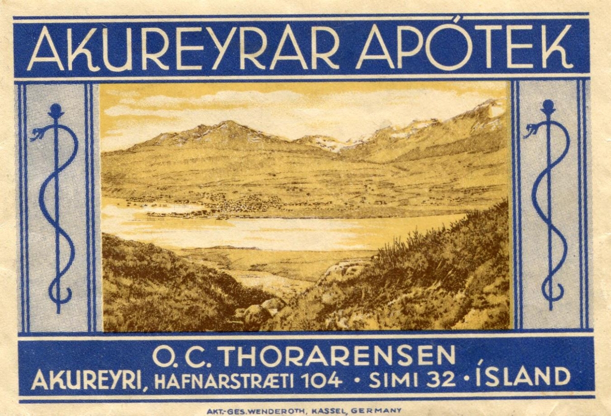 Á umslaginu er mynd frá Akureyri tekin handan fjarðarins. Einnig kemur fram heitið Akureyrar Apótek og nafn apótekarans O. C. Thorarensen og heimilisfangið Hafnarstræti 104. Beggja vegna við myndina er teikning af Askepiosar stafnum (Asklepios var grískur guð lækninga) og slöngunni. Oddur Carl Thorarensen (21.11.1894-10.5.1964) var apótekari í Akureyrar Apóteki 1919-1963. Á bakhlið umslagsins eru taldar upp helstu vörur sem voru til sölu í apótekinu.