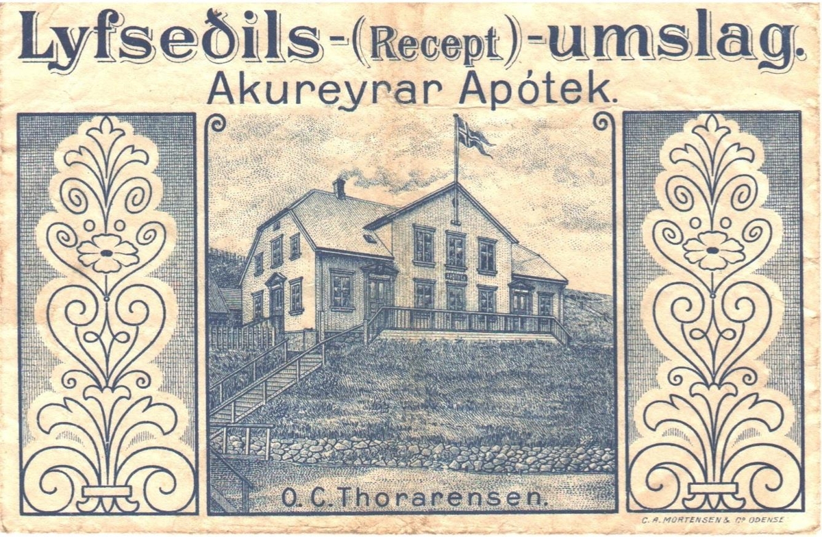 Á umslaginu er mynd af húsinu Aðalstræti 4 á Akureyri, en þar var apótekið til 1928 er það flutti að Hafnarstræti 104. Nánari upplýsingar eru í bréfi sem fylgir með sem ljósrit. Auk þess er mynd af bakhlið umslagsins og þar eru taldar upp ýmsar vörur sem voru til sölu.