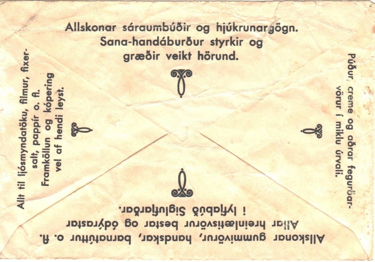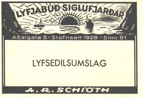 Á umslaginu stendur efst "Lyfjabúð Siglufjarðar" yfir teikningu þar sem sjá má brött fjöll, tvo báta eða skip og miðnætursól. Þar fyrir neðan heimilisfangið Aðalgata 5, Stofnsett 1925, sími 81, Lyfseðilsumslag. Neðst með hvítu letri í svörtum ramma er nafn apótekarans A. R. Schiöth. Aage Riddermann Schiöth (27.6.1902-10.12.1969) stofnaði Lyfjabúð Siglufjarðar og var fyrsti apótekari, 1928-1958