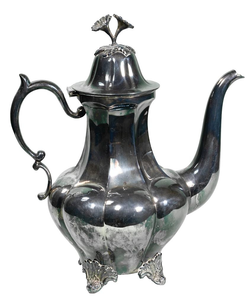 Kaffikanna með víðum bleg og bogadregnu handfangi.