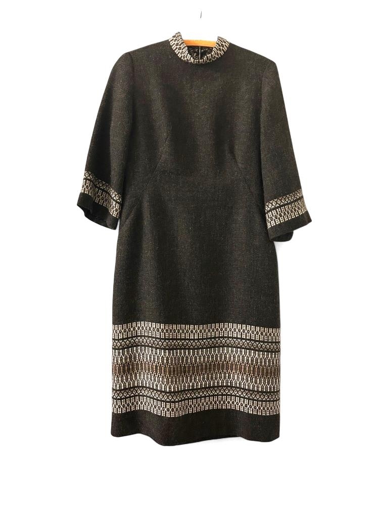 Kjóll, handofinn úr íslensku ullarbandi, síður, jurtalitað garn. Munsturbekkur neðst og á ermum og kraga.