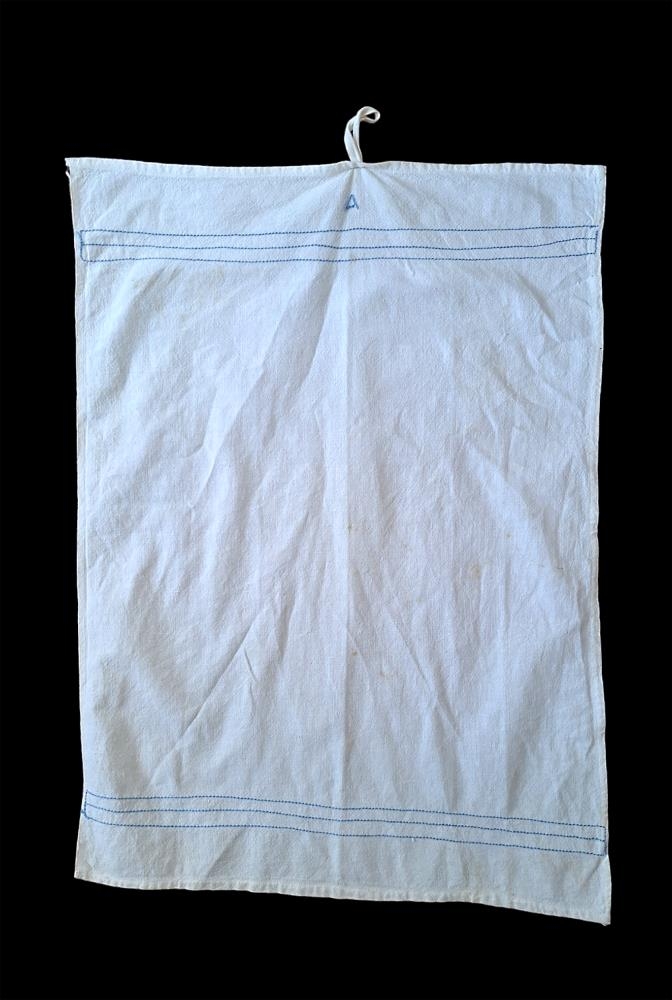 Hvítt viskastykki og merkt með bókstafnum A með bláu