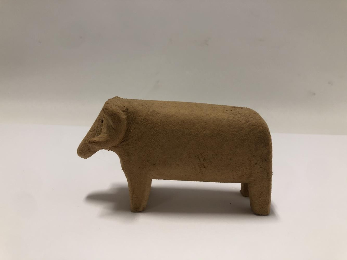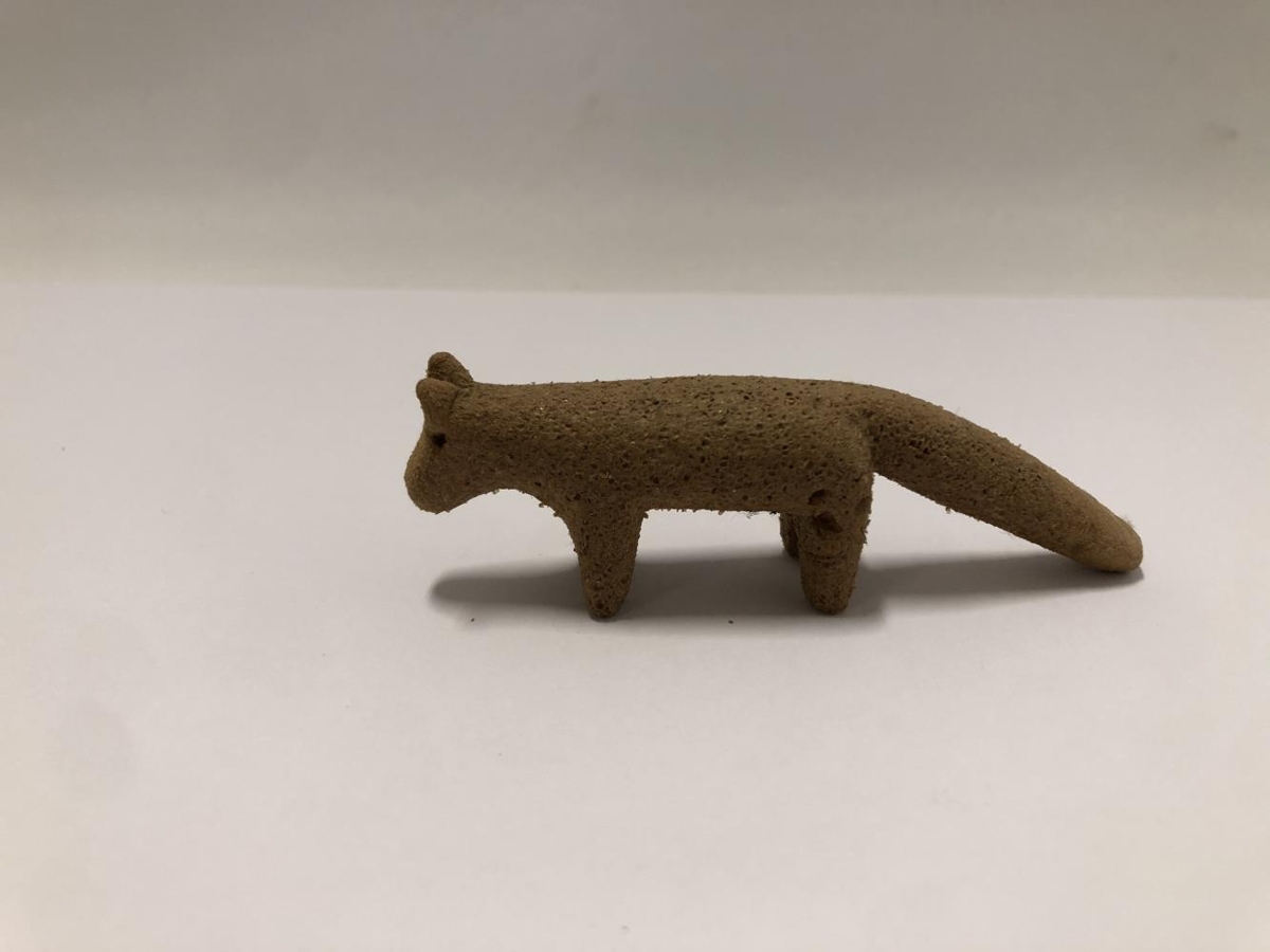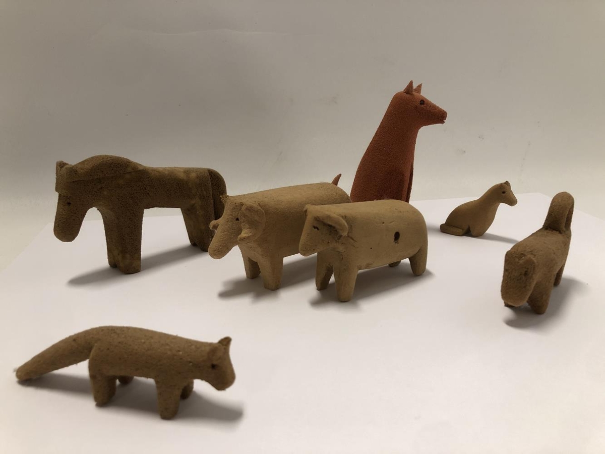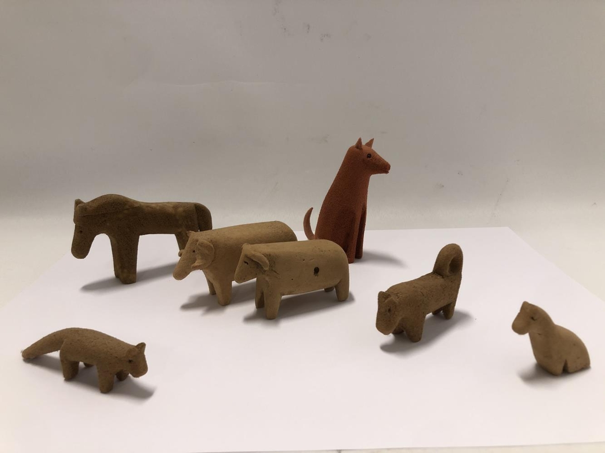 Skorin leikföng. Sex stykki. Hestur, hrútur, kind, hundur, kisa og refur. Útskorin í plastefni úr netaflotum. Finnur var bróðir Ásmundar Sveinssonar og skar hann dýrin út á efri árum þegar hendur hans leyfðu ekki að vinna í erfiðara efni. Hann mótaði líka sitthvað fleira í tré.