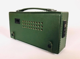 Útvarpið er lítið og nett gulur plastrammi en silfurlitaður platti að framan og svört skífa. Klætt að utan grænt leður og haldfang að ofan.