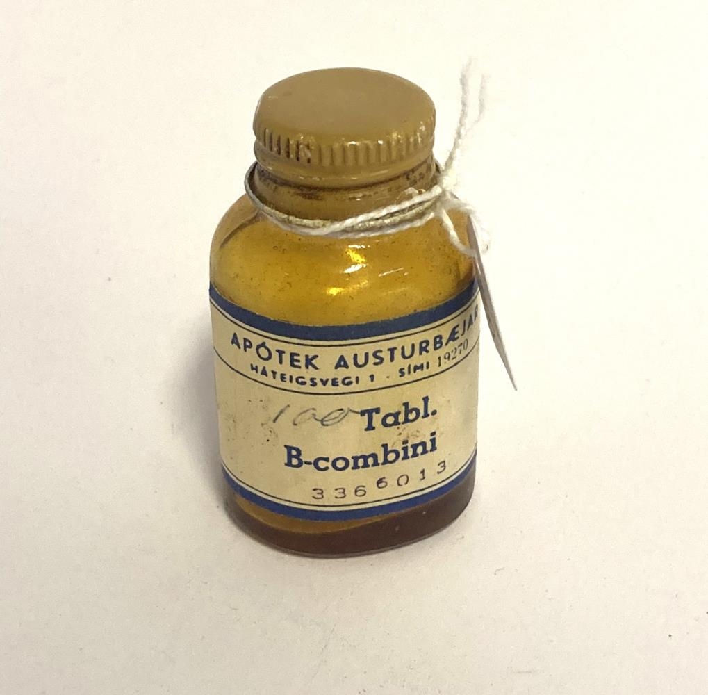 Lyfjaglas úr brúnu gleri með skrúfuðum tappa, Tabl. B-combini. Apótek Austurbæjar.