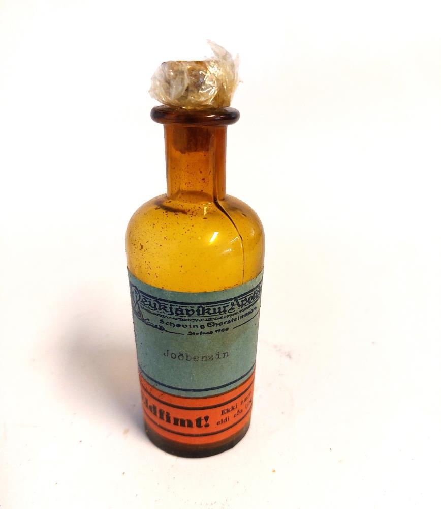 Lyfjaflaska úr brúnu gleri, með korktappa, tóm. Blár miði; Reykjavíkur-Apótek Joðbensín. Einnig álímdur rauður miði sem á stendur "Eldfimt! Ekki nærri eldi eða ljósi".