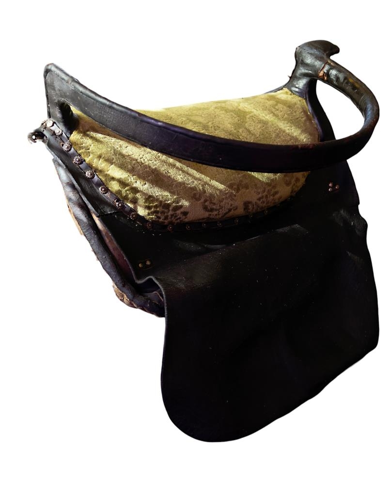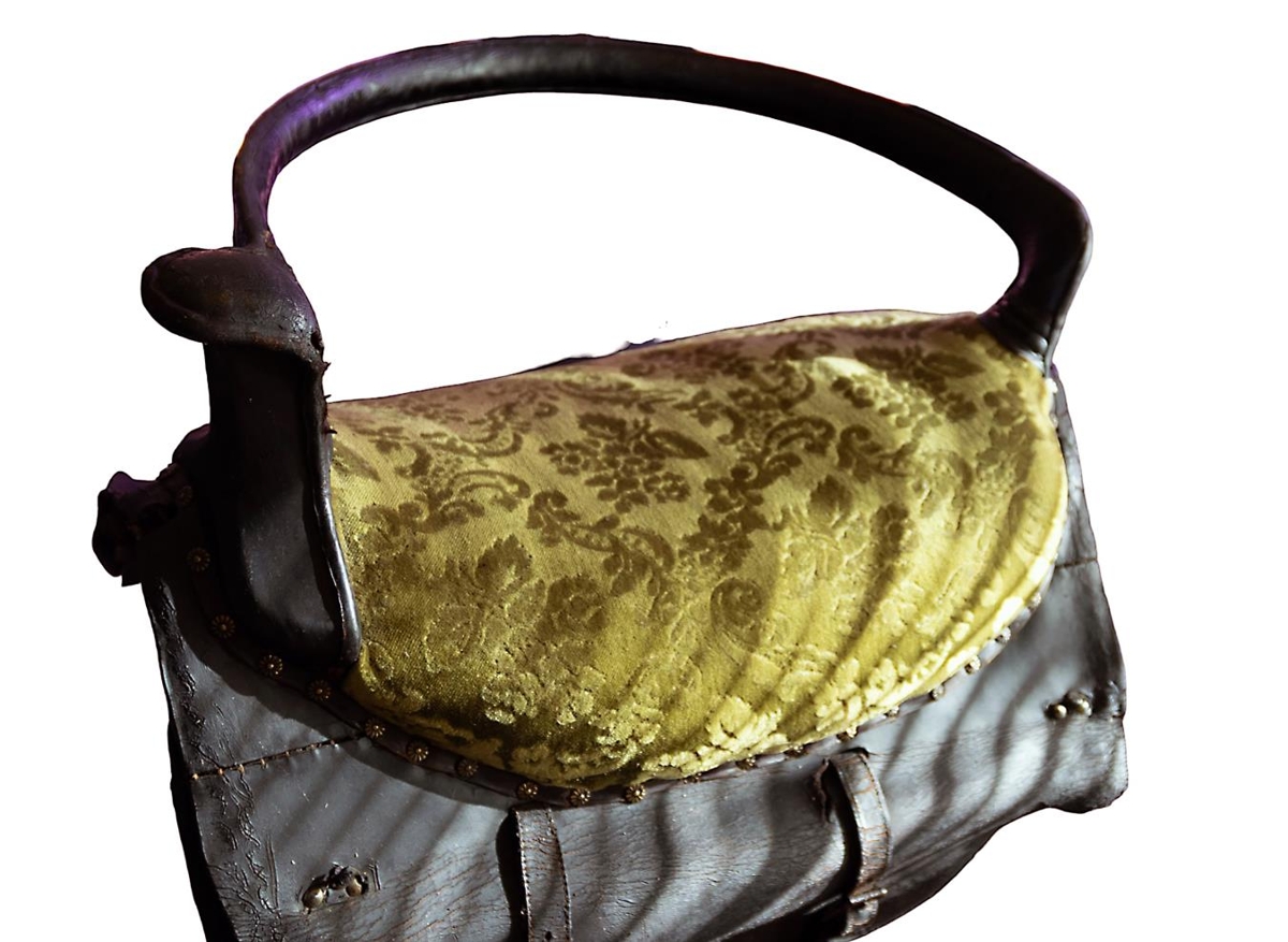 Söðullinn er leðurklæddur með dökkbrúnu leðri og er setan er með grænu plussi og var hann gerður fyrir Guðríði.