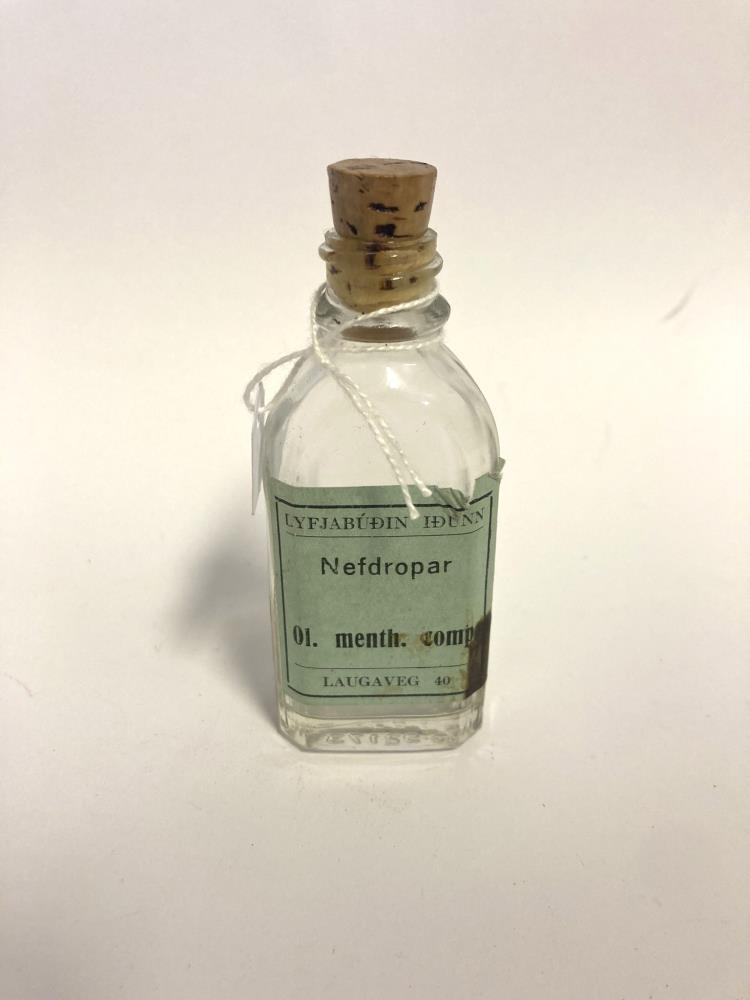 Glerflaska með korktappa. Ljósblár miði frá Lyfjabúðinni Iðunni. "Nefdropar".