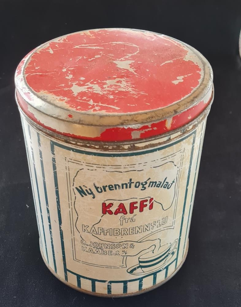 Hvít og bláröndóttur kafffibaukur með rauðu loki. Á bauknum stendur "Ný brennt og malað kaffi frá kaffibrennslu O Johnson & Kaaber h/f"