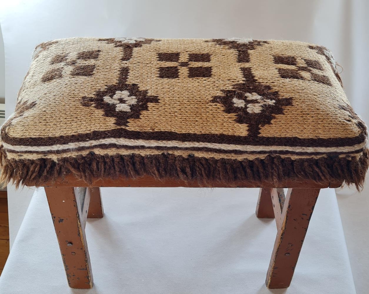 Skemill með prjónuðu bólstruðu sæti, í ljósbrúnum,dökkbrúnum og hvítum lit. Brúnmálaðir tréfætur. Átti Jóhanna Sigurjónsdóttir (1900-1992) Kolbeinsgötu 2 (Baldursheimur) Vopnafirði. Áður húsfreyja á Ljótsstöðum Vopnafirði frá 1923-1966. Gefandi er dóttir hennar.