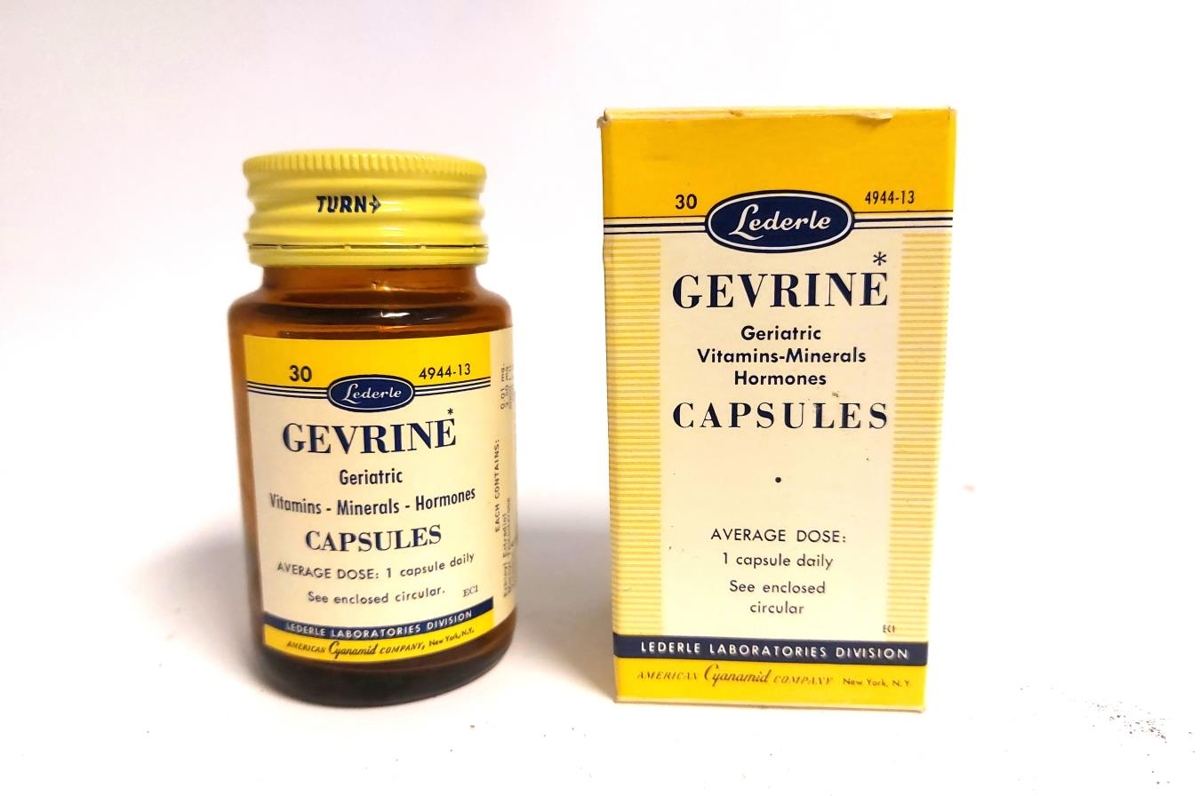 Lyfjakrukka, kringlótt úr brúnu gleri með gulu skrúfuðu loki, tóm. Álímdur gulur og hvítur miði; Gevrine Geriatric Vitamins-Minerals-Hormones Capsules. Á bakhlið er miði frá Apóteki Austurbæjar með notkunarleiðbeiningum. Í gulri pappaöskju. Framleitt fyrir Lederle Laboratories division N.Y.