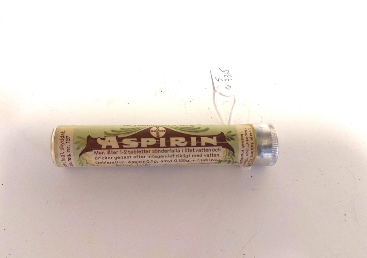 Lyfjaglas/-staukur úr gleri með áltappa, tómt. Álímdur miði; Bayer Aspirin. Notkunarleiðbeiningar á dönsku, en framleitt í þýskalandi.